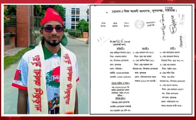 ১১ সেপ্টেম্বর ২০২৫, গাইবান্ধার সুন্দরগঞ্জ উপজেলায় ৮ নং ধোপাডাঙ্গা ইউনিয়নের বাসিন্দা মো:জাহিদুল ইসলাম অসহায় মানুষের জমিতে অবৈধভাবে বাধা প্রদান ও দখলদারিত্ব চালায় তখন গাইবান্ধা জেলার বৈষম্য বিরোধী ছাত্র আন্দোলনের সাবেক সমন্বয়ক রাশেদুজ্জামান আশিক জমি দখল করতে বাধা দেয় এই বিষয়কে কেন্দ্র করে জাহিদুল ইসলাম তখন রাশেদুজ্জামান আশিক কে হত্যার হুমকি দেয় এবং আশিক তখন মনে করেছিলেন তার জীবণ হুমকির মুখে তাই তিনি তার নিরাপত্তার জন্য সুন্দরগঞ্জ থানায় একটি জিডি করেন। এই ঘটনাকে কেন্দ্র করে জাহিদুল ইসলাম আবার ও আশিক কে মারতে আসেন ও আশিক এবং তার বাবা মো:আয়নাল হক এর বিরুদ্ধে মিথ্যা মামলা দায়ের করেন।