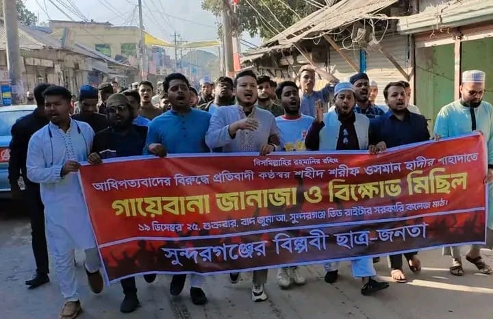 ওসমান হাদির হত্যাকাণ্ডের প্রতিবাদে সুন্দরগঞ্জে বিক্ষোভ মিছিল ও গায়েবানা জানাজা অনুষ্ঠিত