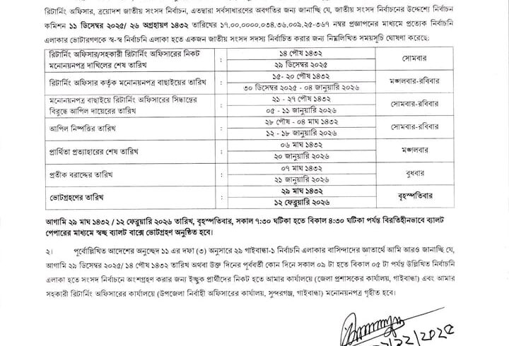 গাইবান্ধা-০১আসনে ত্রয়োদশ জাতীয় সংসদ নির্বাচন ও গণভোট সংক্রান্ত গণ-বিজ্ঞপ্তি প্রকাশ